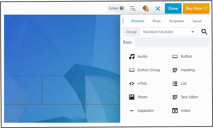 Modules Tab – Access elements like headings, buttons, images, and more. Use the search bar to find modules quickly.